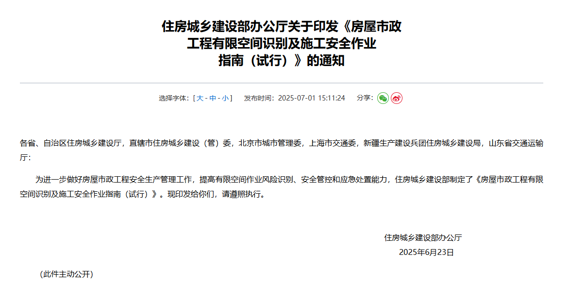 住房城鄉(xiāng)建設(shè)部辦公廳關(guān)于印發(fā)《房屋市政工程有限空間識別及施工安全作業(yè)指南(試行)》的通知